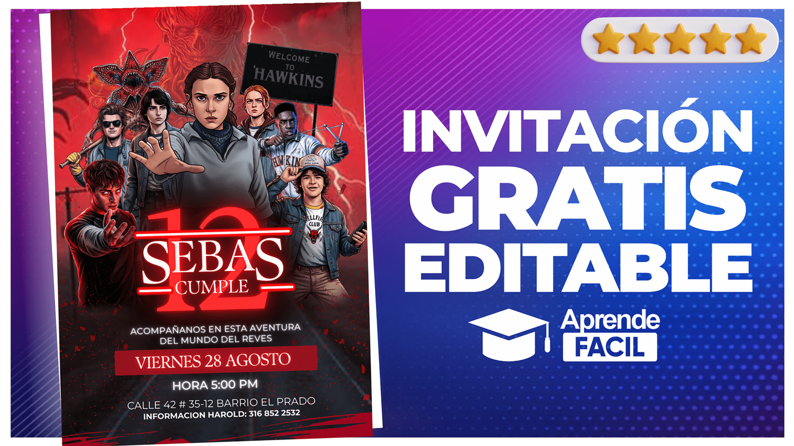 Download this fully editable and free Stranger Things birthday invitation, perfect for creating an original and eye-catching themed party. This digital template has been designed with a style inspired by the series, perfect for easily customizing from your mobile phone or computer without any experience required. You can edit text, colors, and details in just a few minutes and get a professional invitation ready to share via WhatsApp, social media, or print.